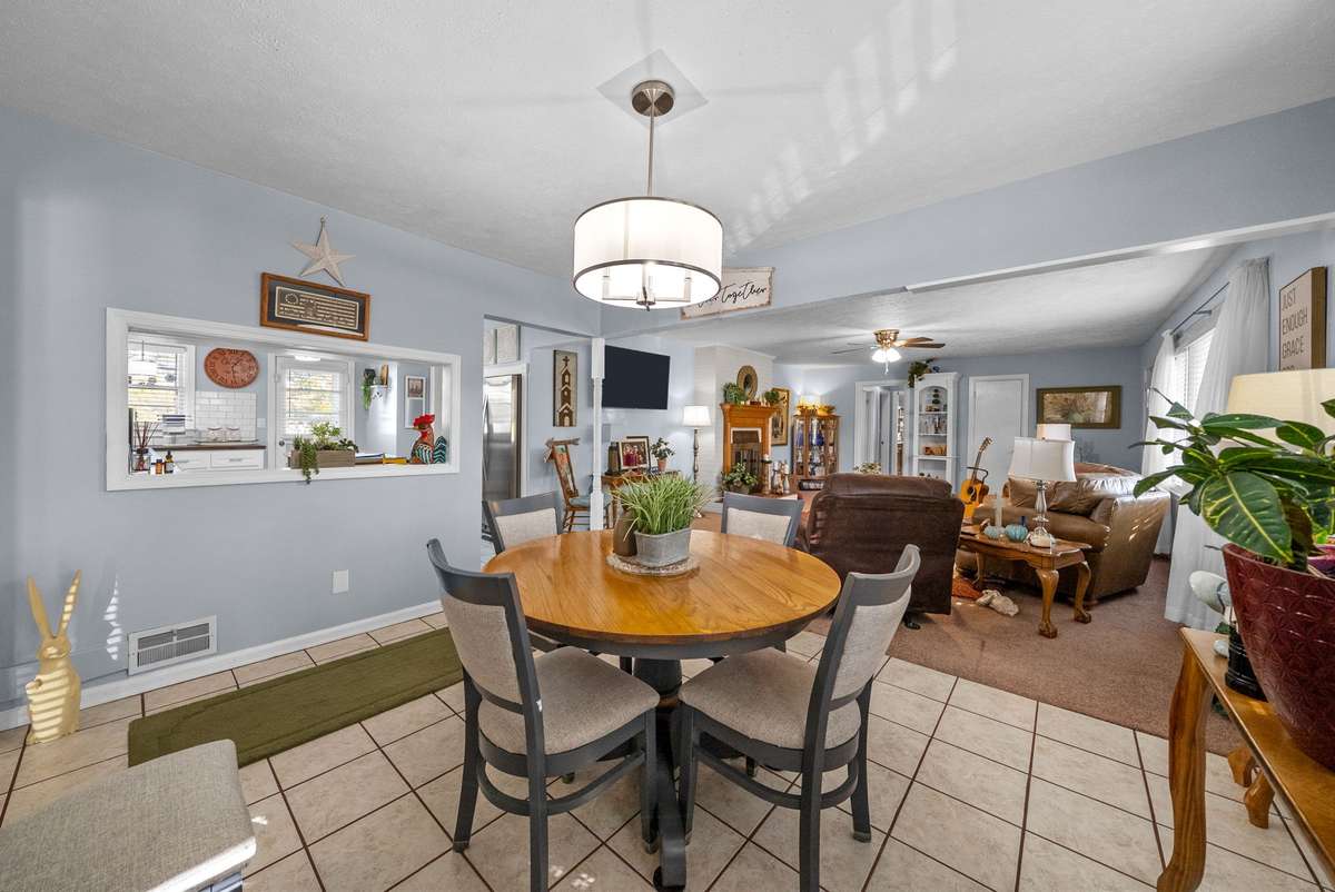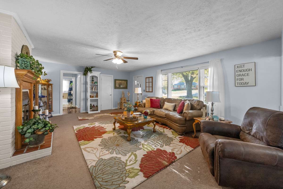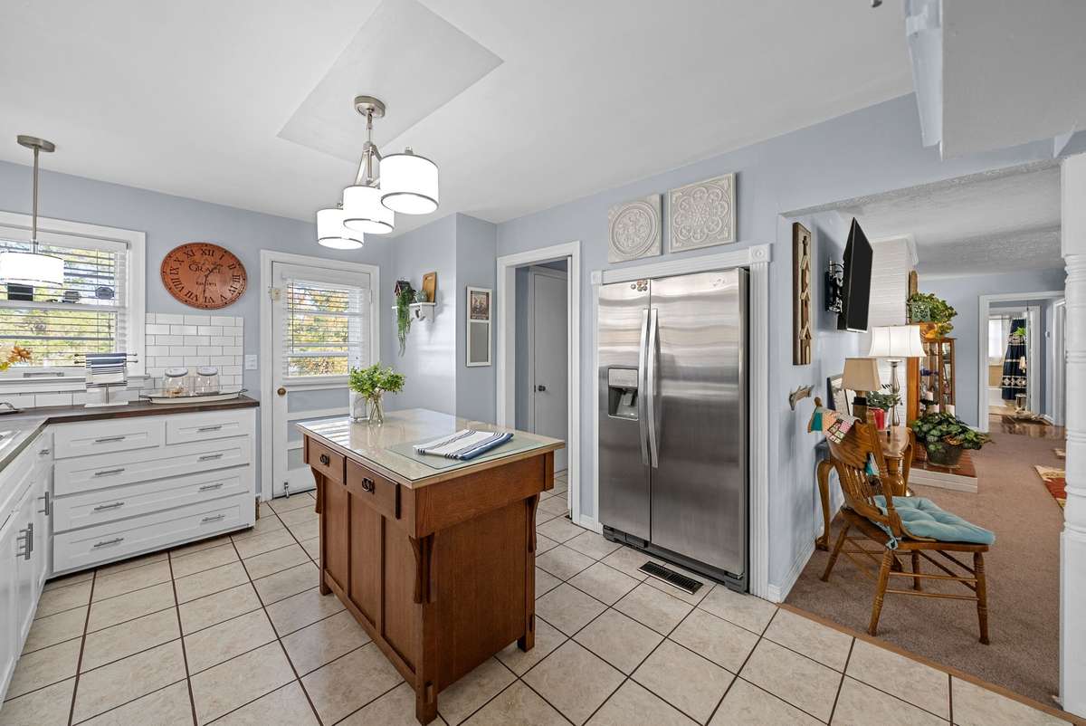 This beautifully maintained 3- bedroom, 1- bath brick home offers a functional layout and plenty of character. Enjoy cozy evenings by the fireplace and cook with style in the kitchen featuring wood countertops and classic subway tile. The home includes a mix of hardwood and tile flooring throughout. Step outside to a spacious deck perfect for entertaining, plus a storage building for extra space. Additional highlights include a concrete driveway and a convenient garage. Move- in ready and full of charm!