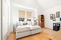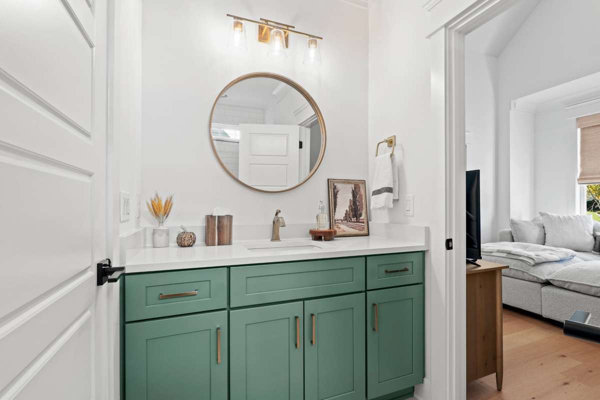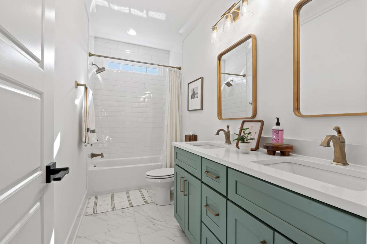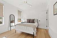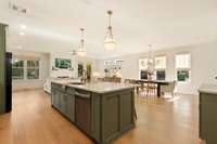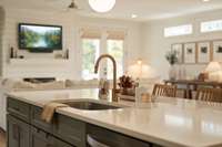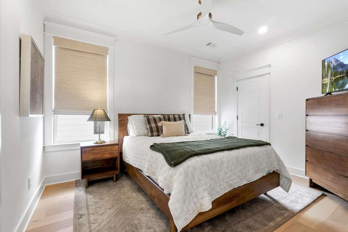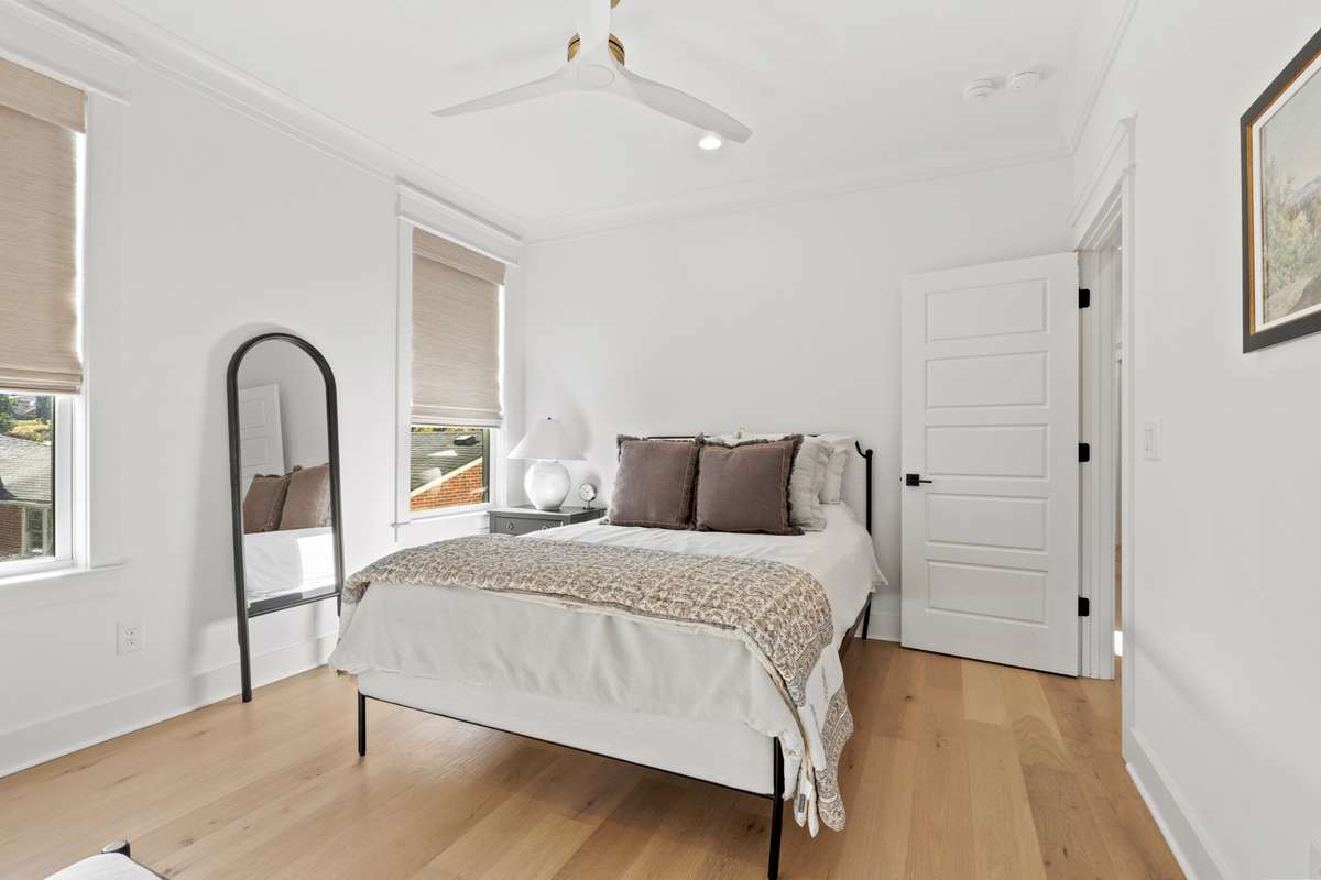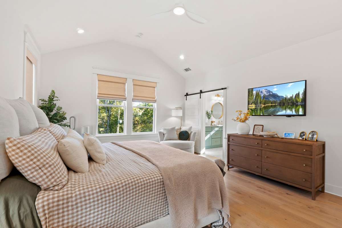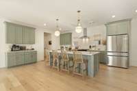 The chef’s kitchen features custom cabinetry, quartz countertops, premium stainless appliances, and a large center island with ample seating. Upstairs, you' ll find the hardwood floors continued throughout the spacious bedrooms, which includes an expansively serene primary suite with vaulted ceilings, a spa- inspired bath, and a generously built- out walk- in closet.