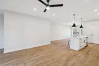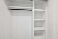 The gourmet kitchen is well appointed & complete with a gas range, tile backsplash, under cabinet lighting, luxurious quartz countertops, soft close cabinet doors & drawers, huge island and refrigerator included. Each bedroom has hardwood flooring, built in closet shelving and a private bath with spa- inspired tile showers creating ideal flexibility for roommates, guests, or work- from- home living.