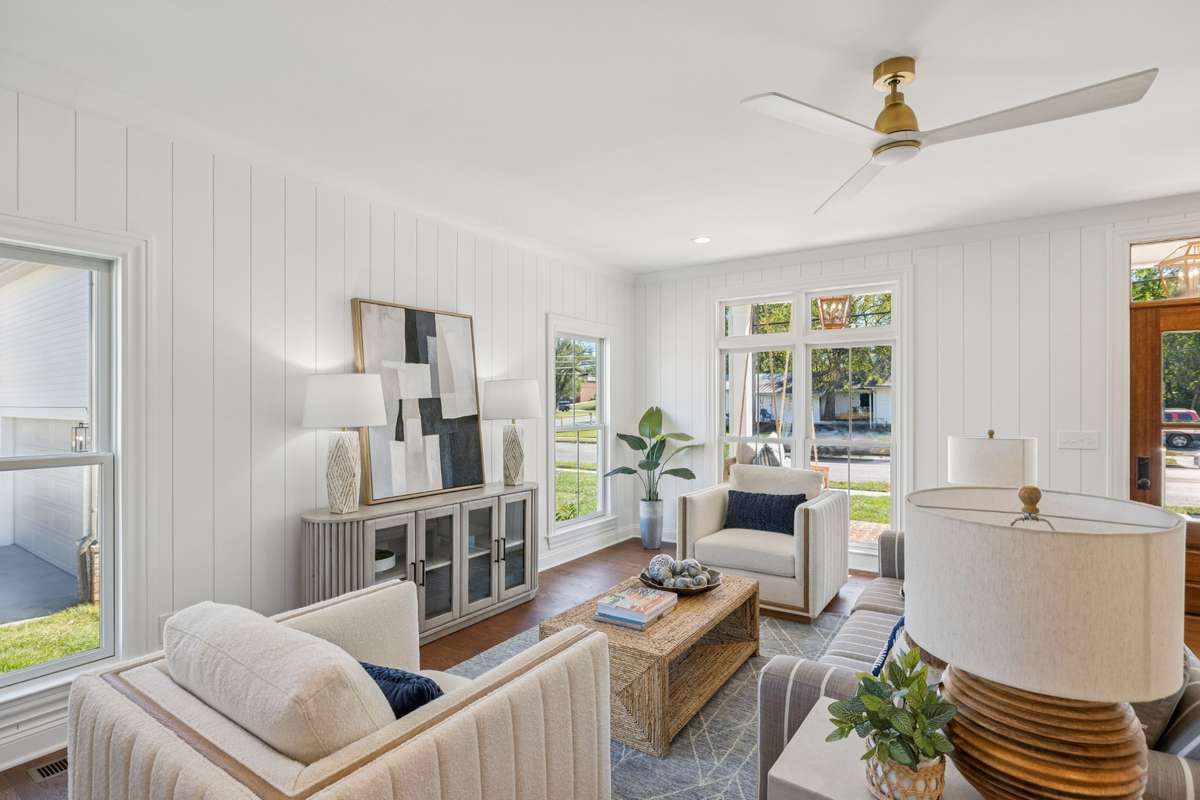 Every detail — from the calming, layered color palette to the elegant lighting and custom touches — strikes a perfect balance of sophistication and easy Lowcountry grace. A deep blue office adds personality just off the main living area, while the cheerful yellow floral mudroom leads to the open backyard — an inviting space for outdoor relaxation and entertaining.