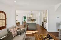 Every element of this 3- bedroom, 2½- bath home has been carefully curated — from graceful arched doorways and elegant lighting to bold wallpaper and natural textures that bring warmth and sophistication throughout. The open living, kitchen, and dining areas are designed for effortless entertaining and connection. A striking custom island, topped with artistic quartzite, anchors the space and invites gathering with family and friends.