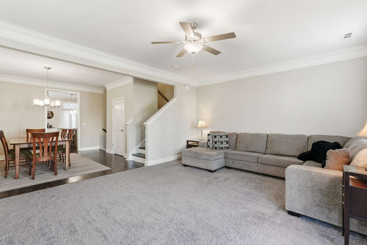 The second floor features a spacious kitchen with quartz countertops, stainless steel appliances, a walk- in pantry, and a versatile flex space ideal for a home office or breakfast nook. Enjoy indoor/ outdoor living with a private deck located right off the kitchen—perfect for morning coffee or evening grilling. The large living and dining areas offer seamless flow and abundant natural light.