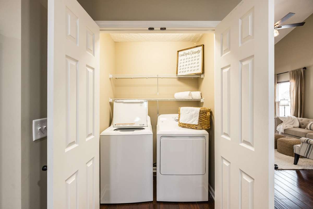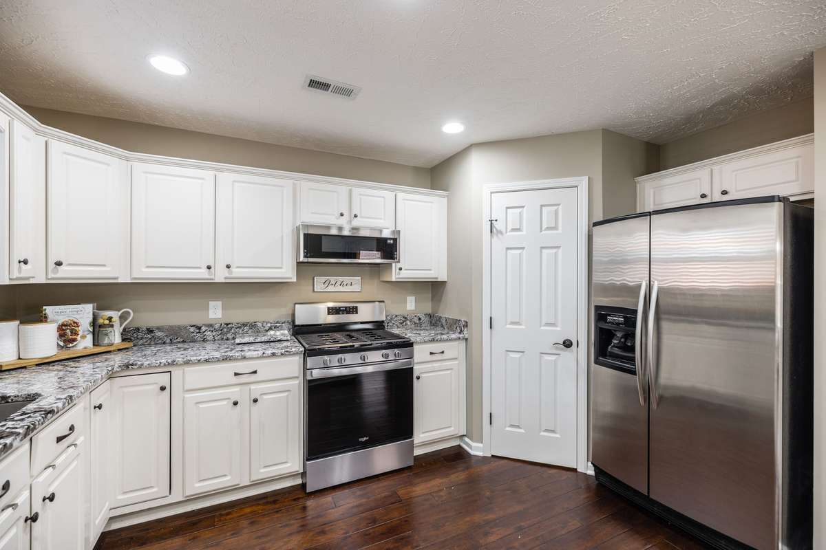 The bright, white kitchen is both stylish and efficient, featuring granite countertops, stainless steel appliances, a gas stove, and a spacious pantry for ample storage.