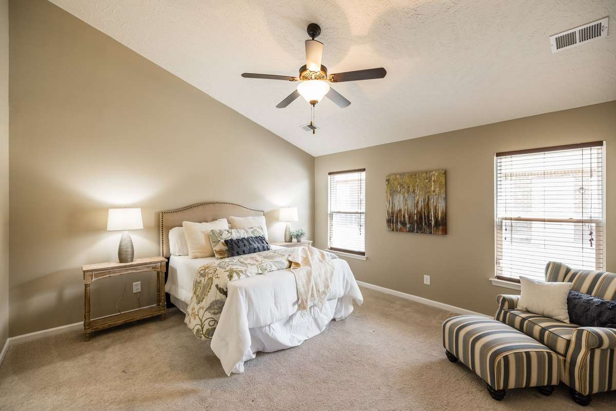 This spacious bedroom features large windows that bring in natural light, creating a bright and inviting atmosphere.