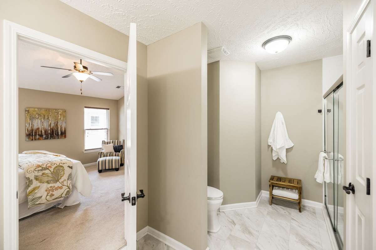 Stepping into this crisp clean guest bath, you'll find it very spacious and private.
