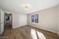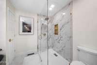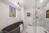 Each bedroom includes custom closet systems, and the serene primary suite delivers spa- like luxury. The bathroom centers on accessibility and elevated materials, featuring a curbless composite- stone shower and a freestanding composite- stone soaking tub, unified by sleek modern fixtures. The secondary bath echoes these finishes for a cohesive feel.