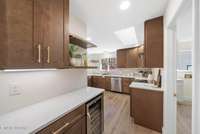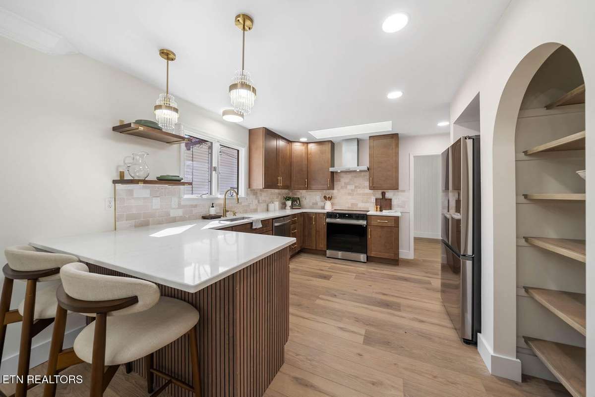 The kitchen blends beauty with everyday usability—quartz countertops, stainless steel Samsung appliances, custom arched open shelving, a 34- bottle wine fridge, bar seating, and soft- close cabinetry with dimmable lighting to set the mood. The dining area leads effortlessly to the back deck, extending living outdoors.