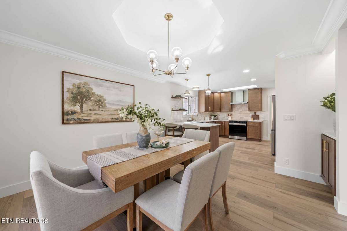 The kitchen blends beauty with everyday usability—quartz countertops, stainless steel Samsung appliances, custom arched open shelving, a 34- bottle wine fridge, bar seating, and soft- close cabinetry with dimmable lighting to set the mood. The dining area leads effortlessly to the back deck, extending living outdoors.
