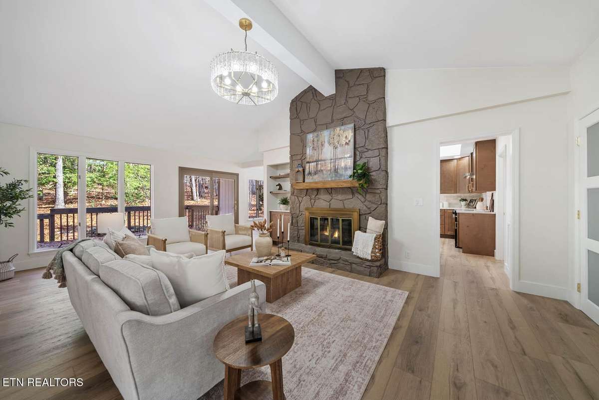 Set on a quarter- acre, this 3- bed, 2- bath home has been meticulously renovated to balance modern function with warm, intentional style. Vaulted ceilings and premium luxury- vinyl plank flooring flow throughout, framed by 6- inch baseboards and designer lighting that elevates every room. A wood- burning fireplace anchors the main living space, while frosted three- panel glass doors along the front wall conceal a custom closet organization system.