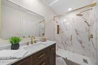 Each bedroom includes custom closet systems, and the serene primary suite delivers spa- like luxury. The bathroom centers on accessibility and elevated materials, featuring a curbless composite- stone shower and a freestanding composite- stone soaking tub, unified by sleek modern fixtures. The secondary bath echoes these finishes for a cohesive feel.