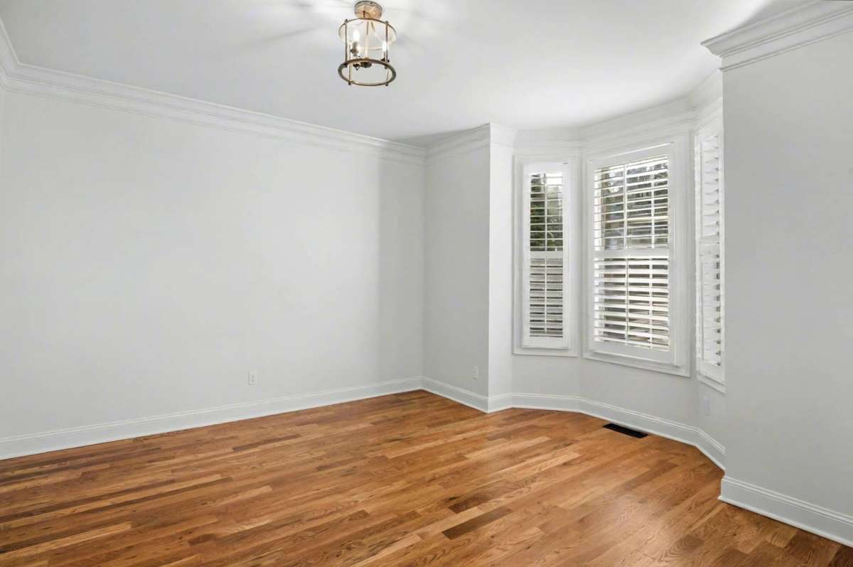 Front room with elegant bay windows and hardwood floors, ideal for a home office or sitting area.