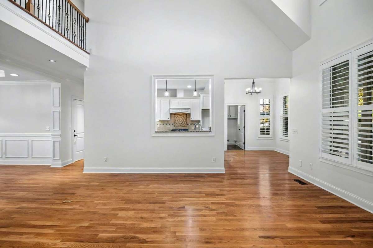 Open view from the great room into the kitchen and dining areas, highlighting the bright, seamless flow of the main living space.