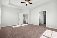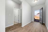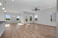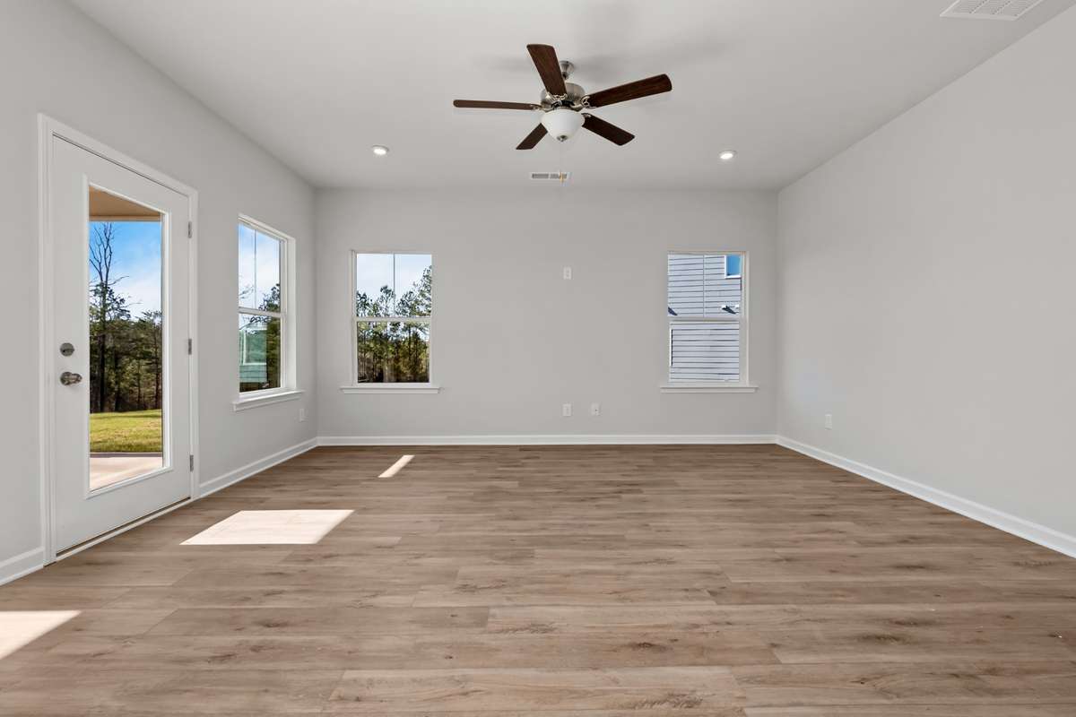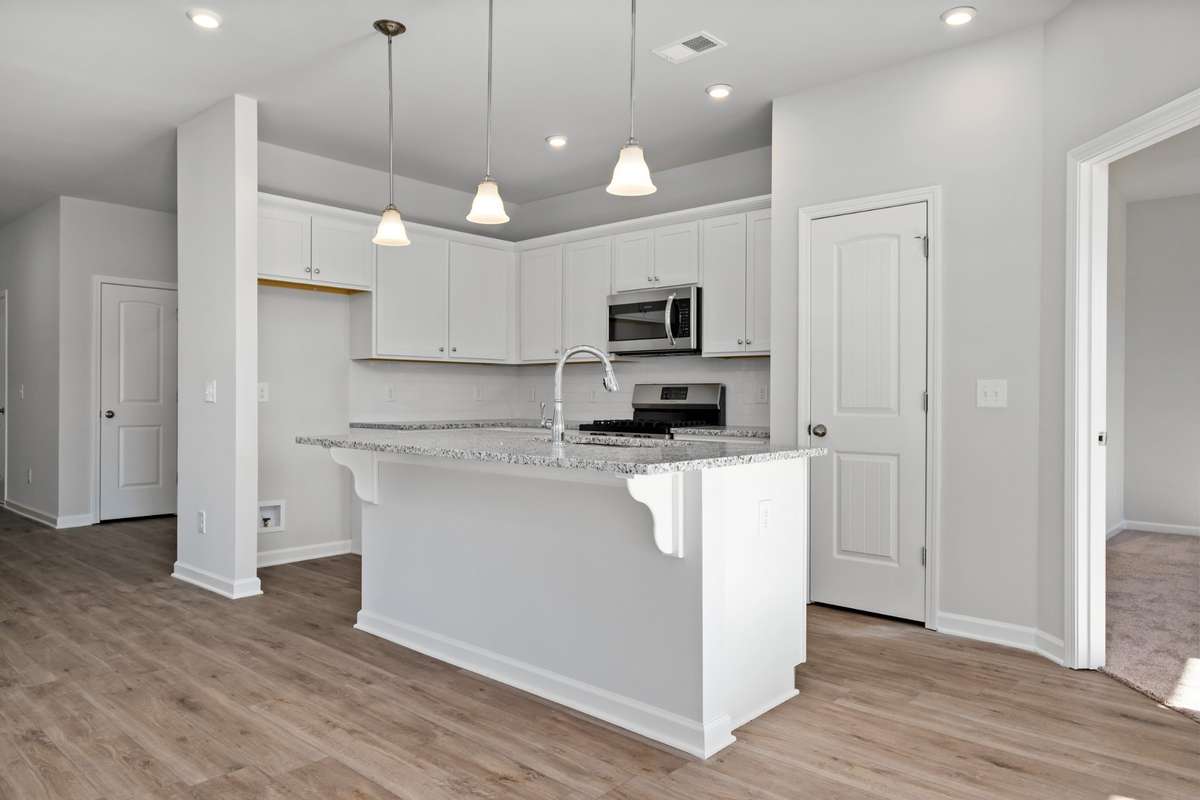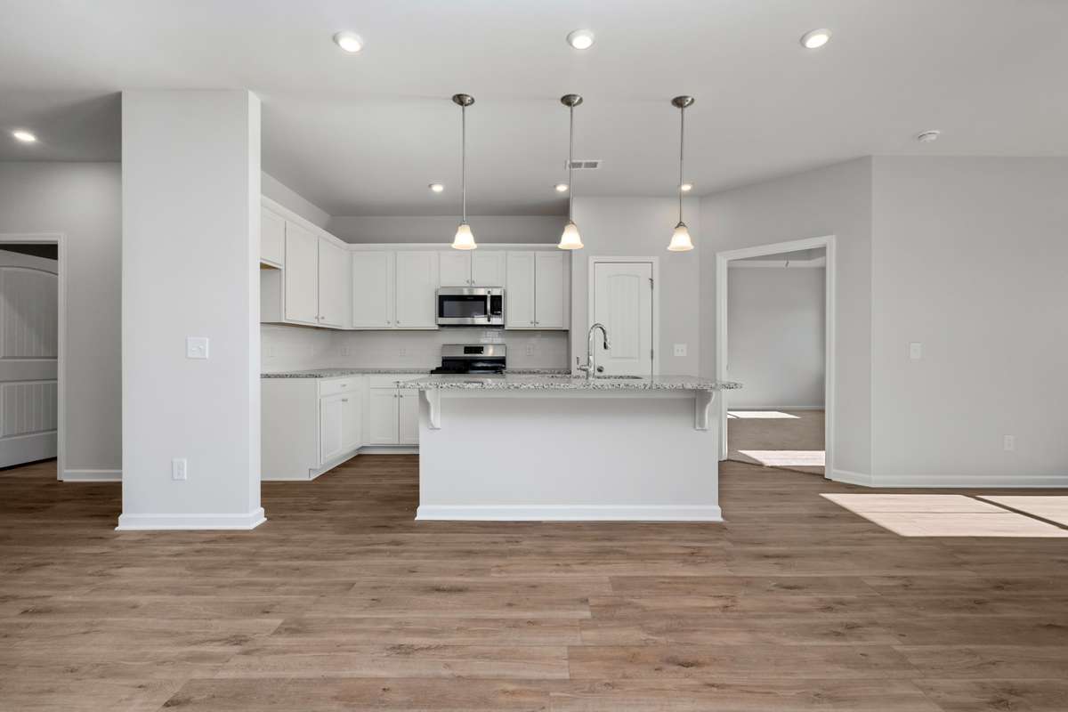 The Langford at The Oaks by Smith Douglas Homes is a flexible one- level living space, punctuated by a light- filled dining area with views of the backyard and access to a covered patio. An adjacent open kitchen with a central island overlooks the spacious family room. The owner' s suite, tucked away at the back of the home, feels like a private sanctuary with its spa- like bath and sizable walk- in closet. A conveniently located and extra- large laundry room enhances everyday living and offers optional convenience right into the laundry.