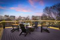 Every level of the home is both artful and intentional, connected by an elevator and layered with outdoor living spaces that frame the city from every perspective. The main level opens to a private courtyard anchored by a pool, covered porch, and fireplace — an unexpected urban sanctuary that blurs the line between indoor and outdoor living.