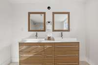Unique double vanity compliments the gorgeous shower design.  Three windows let in light and fresh air.  Light fixture being installed.