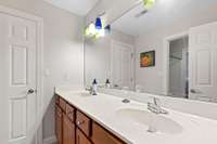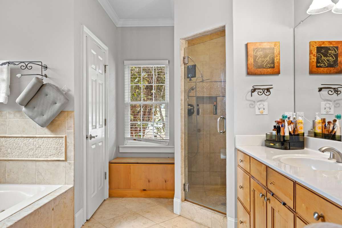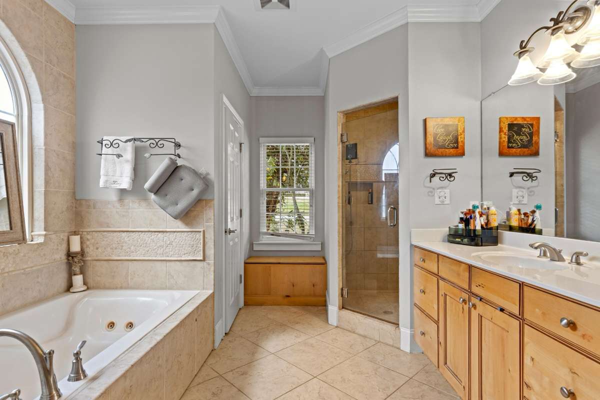 The primary suite serves as a private retreat with trayed ceilings, a jetted soaking tub, walk- in shower, seated vanity, and a walk- in closet. Each additional bedroom boasts its own private bathroom for ultimate comfort and convenience.