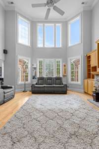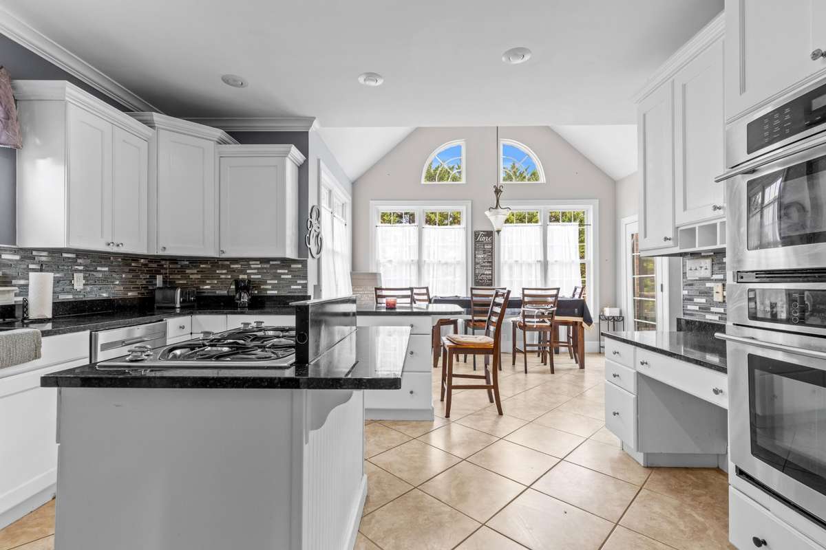 Step inside to a grand living room centered around a stone fireplace, framed by floor- to- ceiling vaulted windows that flood the space with natural light and overlook the backyard and pool. The gourmet kitchen features a large island, double wall ovens, built- in stainless steel appliances, and a bright breakfast nook, while the dining room offers an inviting setting for hosting.