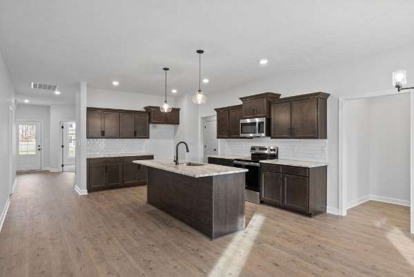 Four bedrooms all on the main floor make this stunning ranch- style home as functional as it is beautiful! Step through the front door and you’ll immediately feel the airy openness of the expansive open- concept floor plan. The heart of the home is the large, inviting kitchen featuring a generous island that’s perfect for entertaining or casual meals. Overlooking the spacious great room with its cozy shiplap fireplace, this layout ensures you’ll always be part of the conversation.
