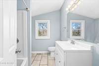 • Guest bath with tile flooring, tub/ shower combo, and large vanity