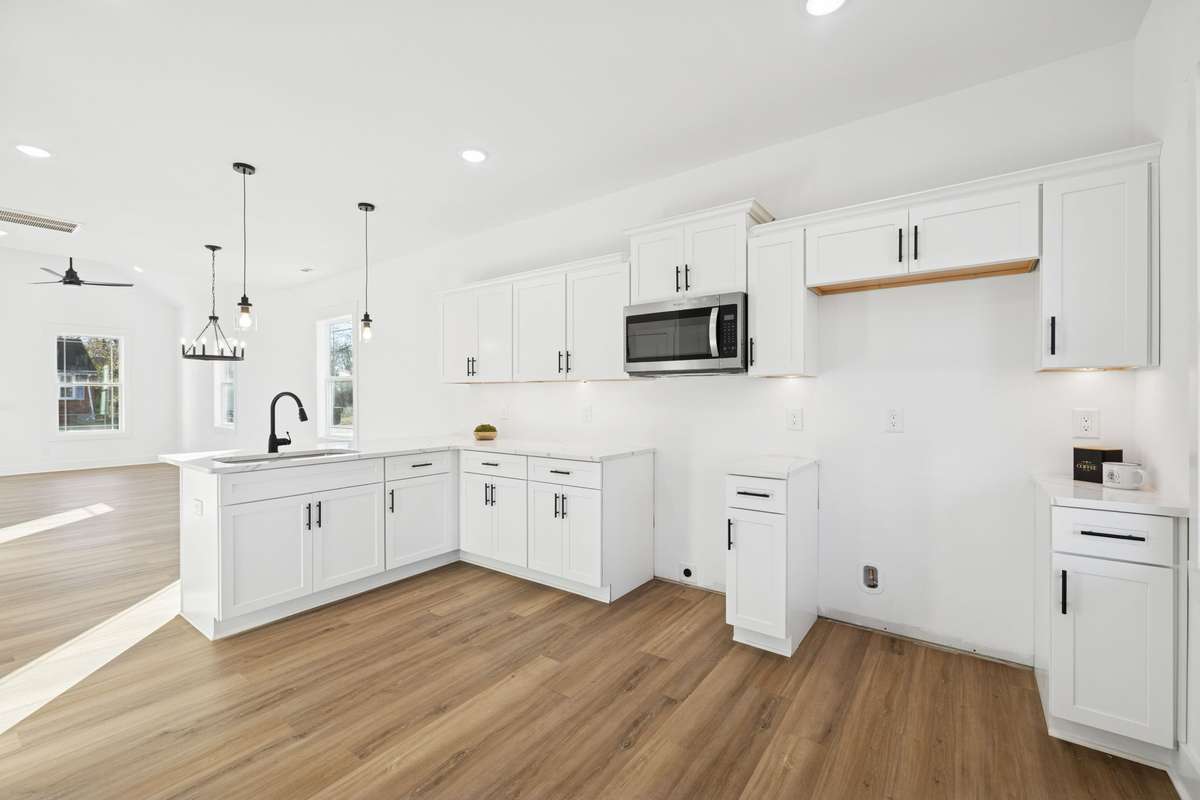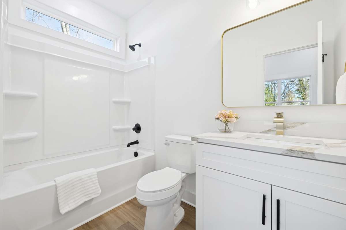 New construction in Springfield with thoughtful finishes and a functional layout. This home offers an open living area filled with natural light, vaulted ceilings with an exposed beam, and a spacious kitchen with white cabinetry, quartz countertops, under cabinet lighting and modern black fixtures. The primary suite features its own vaulted ceiling, a bathroom with quartz counters, gold fixtures, and a tub- shower combo. The guest bath includes matching finishes for a cohesive feel. Enjoy a covered front porch with a beautiful gable detail and a covered back patio overlooking a level, tree- lined backyard. Conveniently located close to schools, parks, and downtown Springfield. Move- in ready!