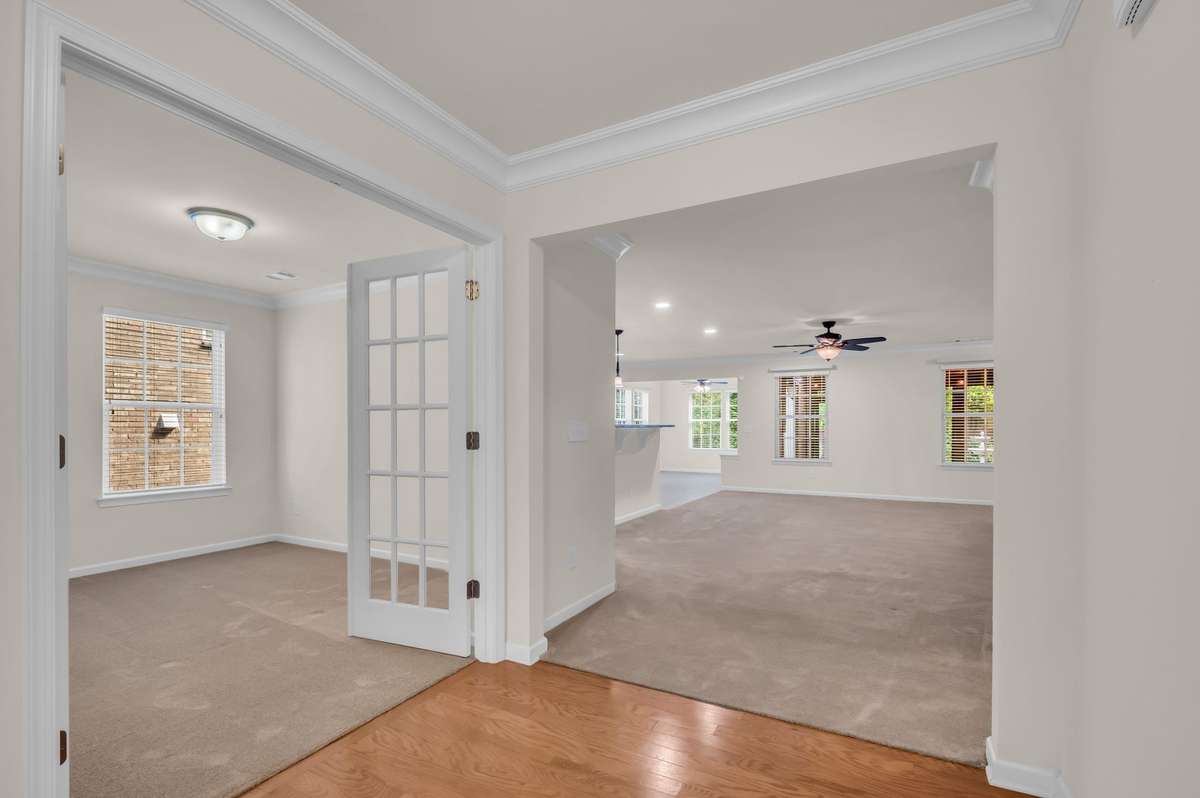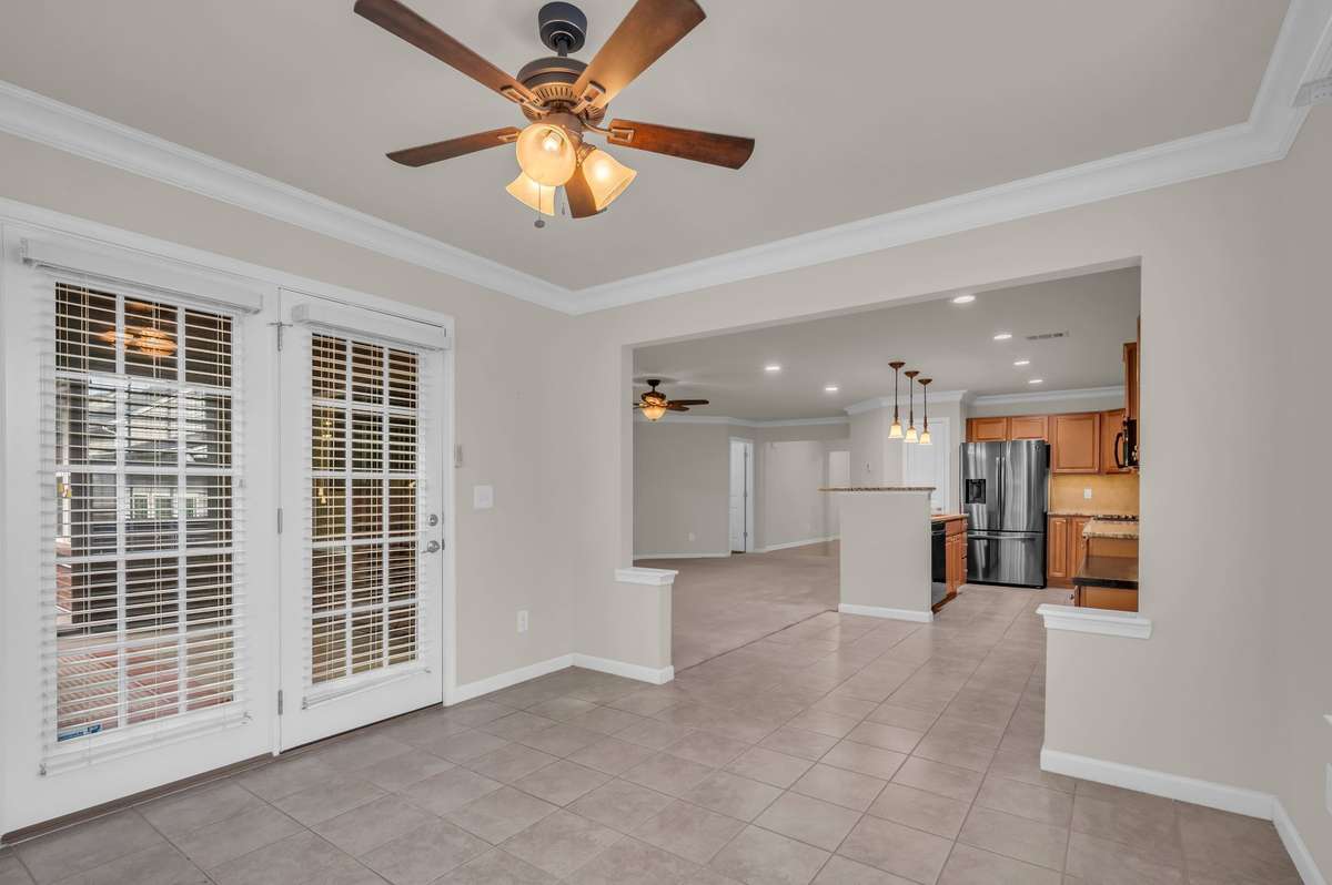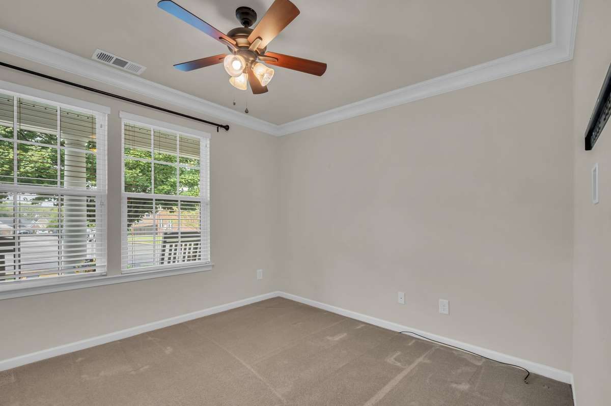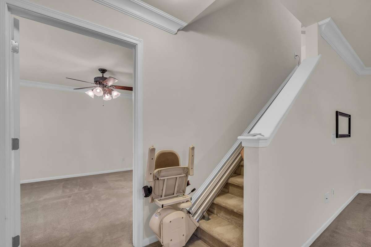 Terrific Brentwood location ~ Low maintenance living with charming front porch ~ Open floorplan ~ Main floor primary suite & additional BR on main level ~ Office with french doors~ Spacious kitchen, all appliances remain ~ Sunny dining area ~ Amazing large screened patio includes big screen TV ~ Upstairs features bonus room, bedroom & full bath, perfect in- law suite with electric Lift Chair to 2nd floor ~ Lovely private back yard with patio ~ Irrigation ~ Convenient location to grocery, restaurants & shopping