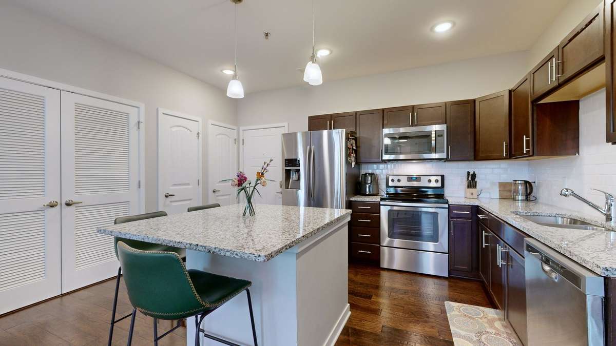 Discover urban living at its best in this inviting East Nashville condo—featuring one of Solo East’s most desirable floor plans. Sunlight fills the space through well- placed windows that offer brightness and privacy, with no direct sightline to neighboring units. The same privacy extends to the cozy balcony, accessible from both the primary bedroom and the main living area. Inside, you' ll find hardwood floors, 9- foot ceilings, stainless steel appliances, granite countertops, an island with seating, a pantry, and convenient in- unit laundry hook- ups. Both generously sized bedrooms offer large walk- in closets and spacious ensuite bathrooms. The location delivers true East Nashville living with walkability to coffee shops, restaurants, the YMCA, and quick access to Downtown Nashville. Community perks include a visitor call box, EV charging stations, a shared grill, a bike rack, dog waste stations, and a gated parking lot with controlled access. Two behind- the- gate parking stickers with fob access are included. Not eligible for STR; LTR approval available through the HOA.