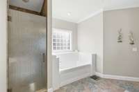 The living room impresses with its soaring ceiling, triple windows, and cozy fireplace, creating a warm and welcoming centerpiece for the home. The primary suite is a true retreat, complete with trey ceilings and a spa- like ensuite featuring double sinks, a soaking tub, and a separate shower.