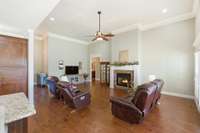 Step through the inviting foyer into an open- concept living area where the kitchen and living room flow seamlessly together—perfect for everyday living and entertaining. The chef- friendly kitchen features a large island, stone countertops, and stainless steel appliances, while the nearby dining room is tucked away in a bright, airy corner filled with natural light.