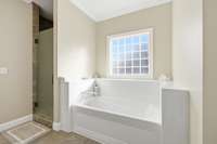 The living room impresses with its soaring ceiling, triple windows, and cozy fireplace, creating a warm and welcoming centerpiece for the home. The primary suite is a true retreat, complete with trey ceilings and a spa- like ensuite featuring double sinks, a soaking tub, and a separate shower.