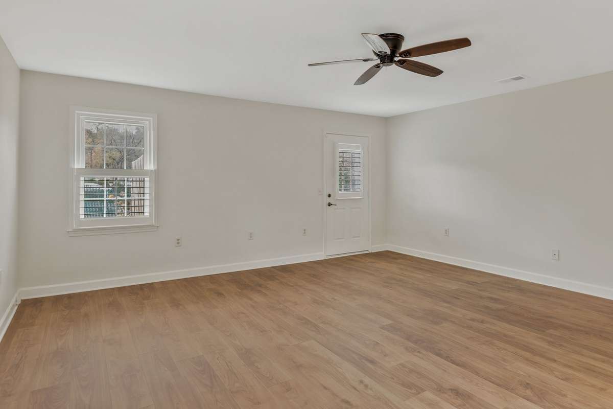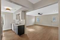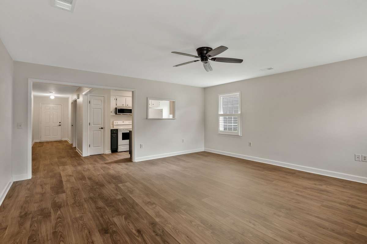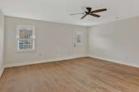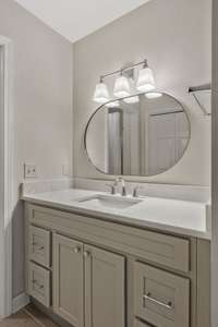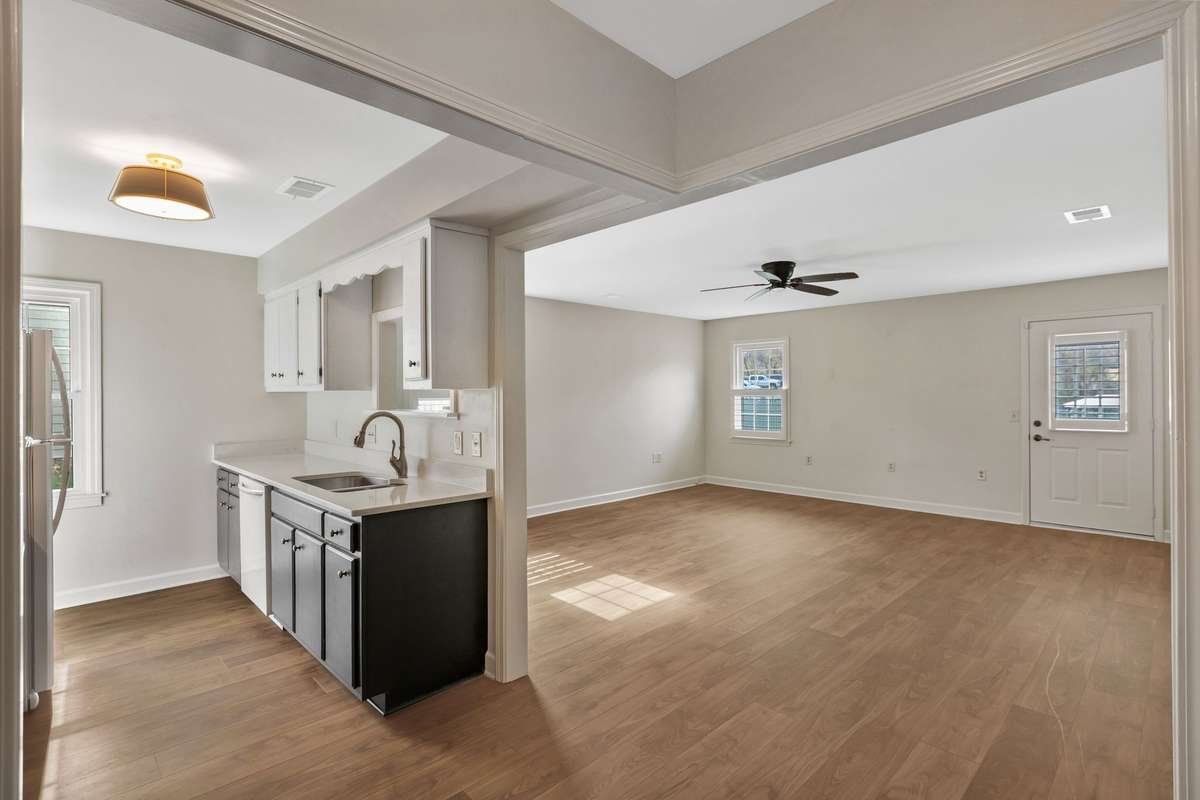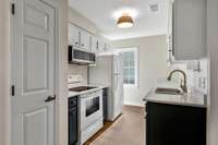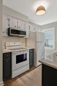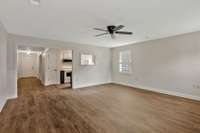 Fresh neutral paint, high- end vinyl plank flooring, new bedroom carpet, and stylish new lighting create a modern, inviting feel throughout. The kitchen and both baths feature brand- new quartz countertops, and the spacious primary suite includes an en suite bath with a walk- in shower. A full- size, efficient washer and dryer are included for convenience.