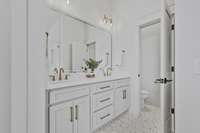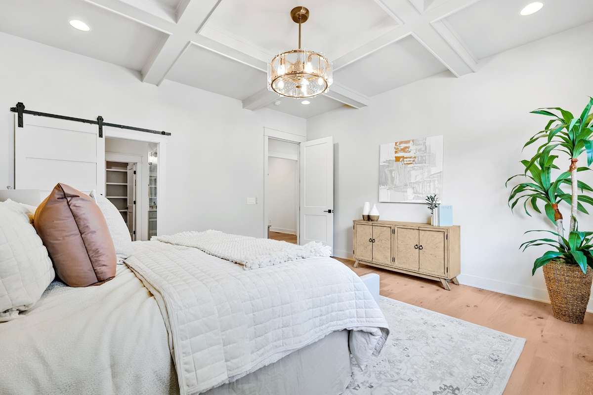 Step inside to find custom trim work in every room, crown molding throughout, and hardwood floors that carry through the home. The main- level primary suite features a coffered ceiling and spa- like bath, creating a serene retreat. The gourmet kitchen boasts quartz countertops in the kitchen, baths, and laundry, a full- height quartz backsplash, a striking mitered- edge island with 2” thickness, upgraded plumbing and lighting fixtures, and a custom plastered fireplace as a centerpiece in the great room.