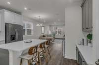 Step inside to an upgraded kitchen featuring premium cabinetry, built- in desk space, a generous walk- in pantry, stainless appliances, and sleek quartz countertops—perfect for everyday cooking, meal prep, or entertaining friends. The open- flow layout connects seamlessly to the living and dining areas, creating an inviting space full of natural light.