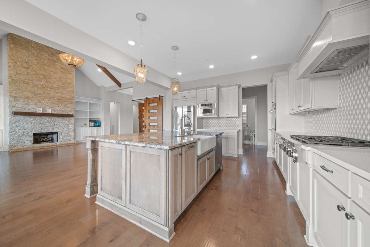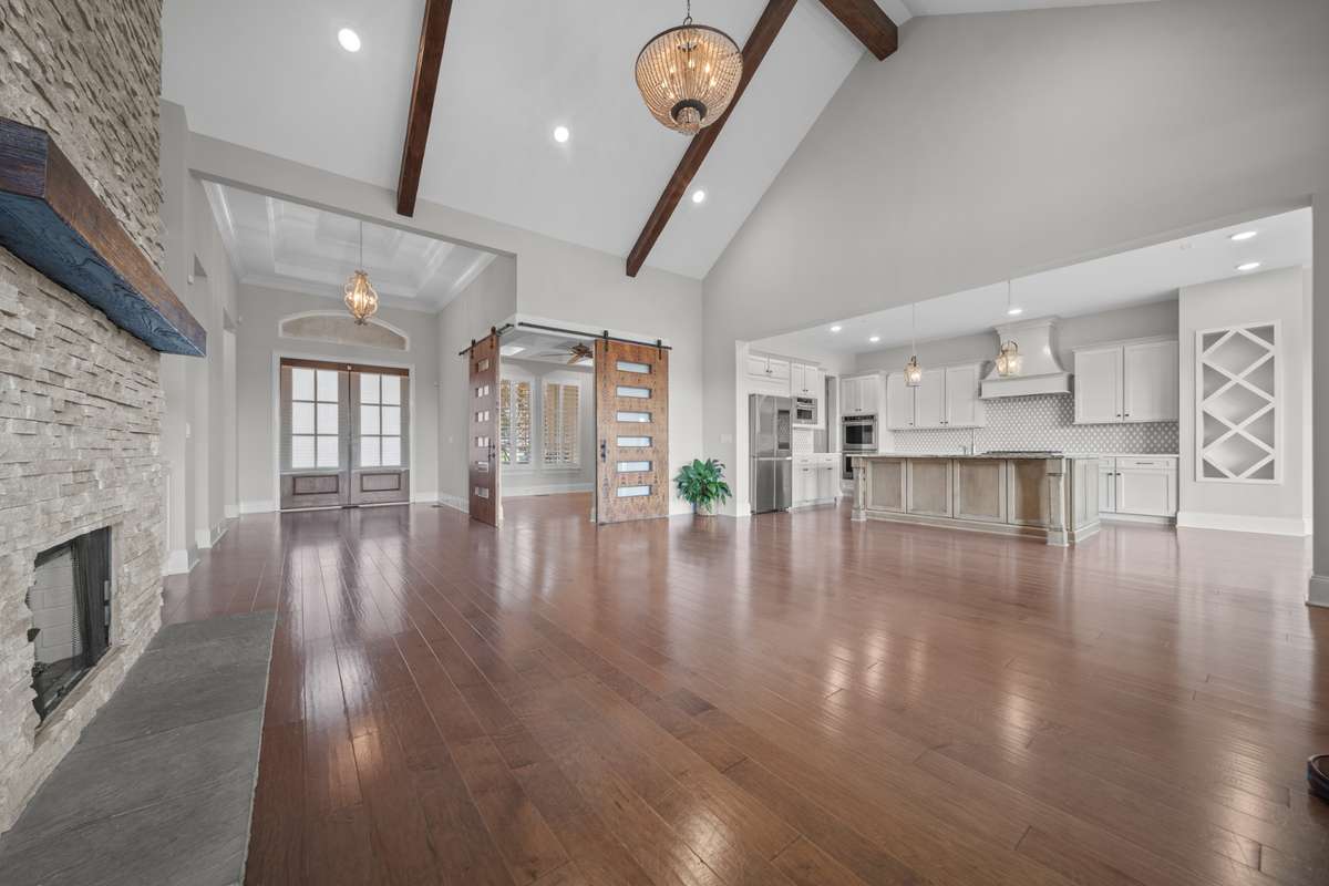 This stunning luxury home blends timeless architectural charm with modern designs. A classic brick exterior, dramatic rooflines, plantation shutters, and manicured landscaping create exceptional curb appeal. Vaulted ceilings with exposed beams, rich hardwood floors, and a grand floor to ceiling stacked stone fireplace set an elegant tone. A wall of oversized windows fills the open concept living area with natural light and sunset views. The gourmet kitchen is a showstopper! Complete with an oversized quartz island, custom vent hood, designer backsplash, stainless steel appliances, and gorgeous cabinetry. The main level primary suite is pure luxury, offering a spa inspired bath and a dream worthy walk- in closet. A dedicated office/ media room, elegant finishes throughout, and inviting indoor/ outdoor living spaces add even more “wow” at every turn. Maintained and move- in ready, this home delivers upscale living in a highly desirable community. Prepare to fall in love the moment you walk in!