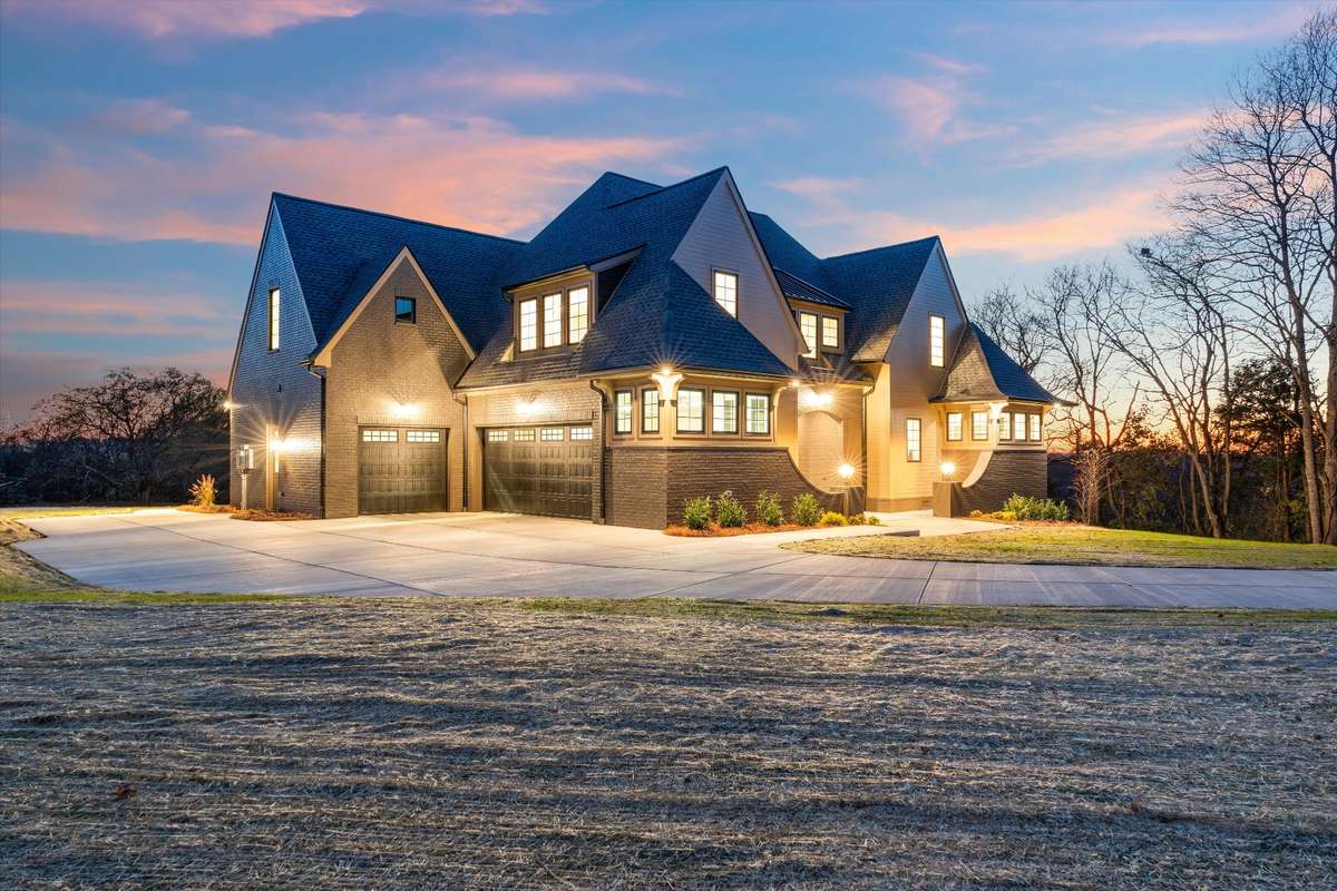 Welcome to this stunning custom- built modern Tudor home, perfectly positioned on a spacious, gently sloping lot that blends privacy with picturesque surroundings. From the moment you pull into the long, curved driveway, this home commands attention with its striking architectural lines, steep roof pitches, and beautifully balanced blend of warm siding and dark brick accents.