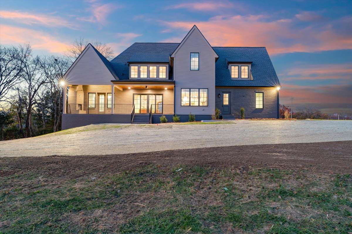 Welcome to this stunning custom- built modern Tudor home, perfectly positioned on a spacious, gently sloping lot that blends privacy with picturesque surroundings. From the moment you pull into the long, curved driveway, this home commands attention with its striking architectural lines, steep roof pitches, and beautifully balanced blend of warm siding and dark brick accents.