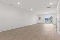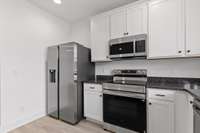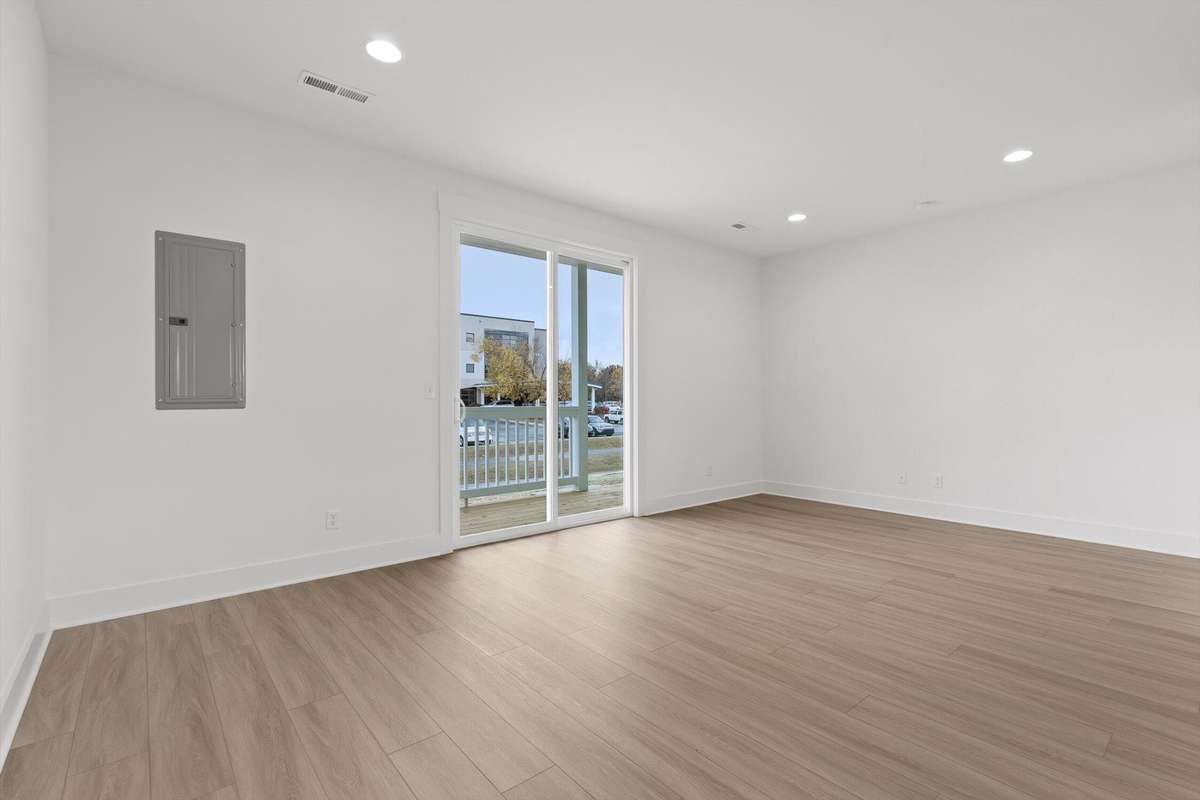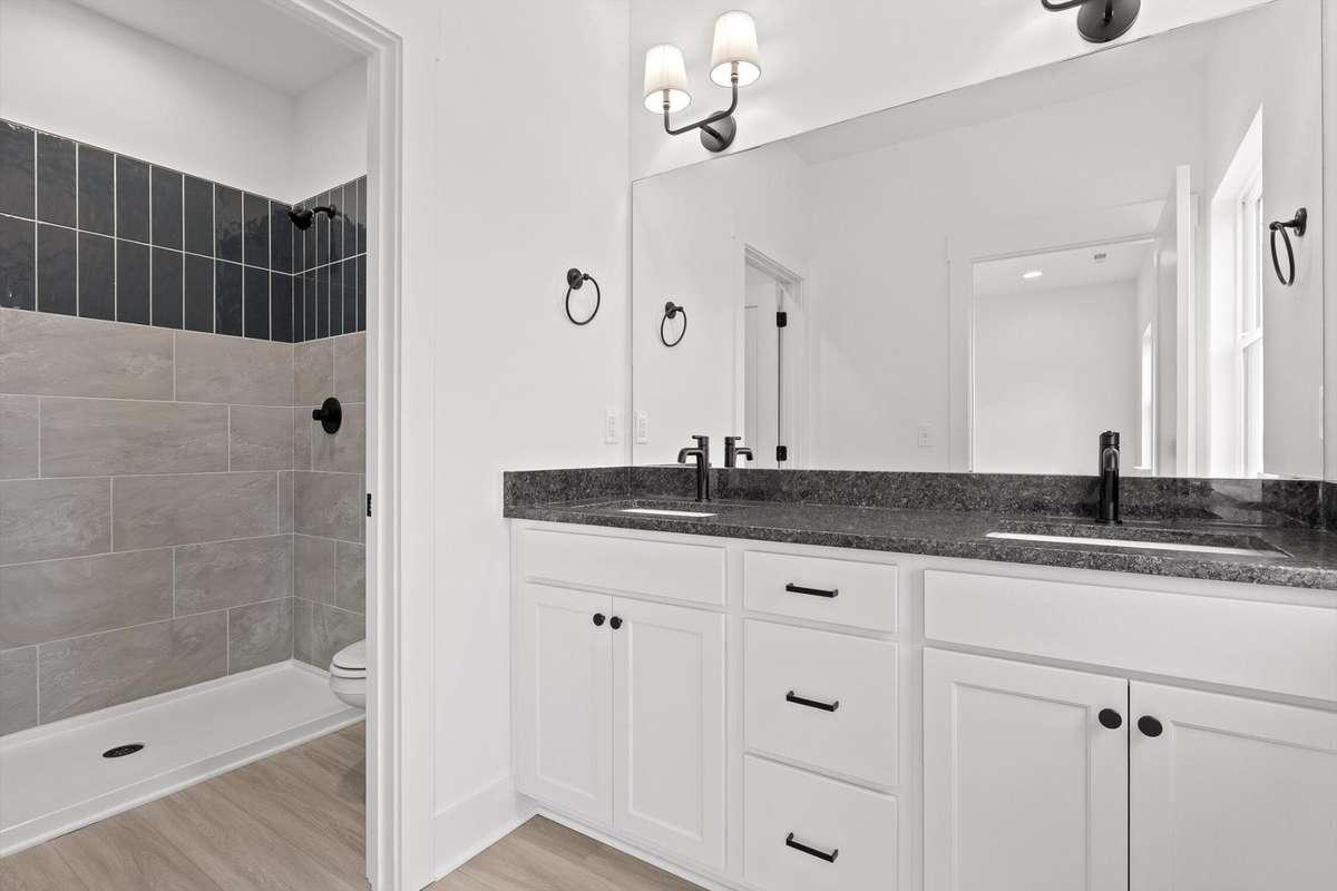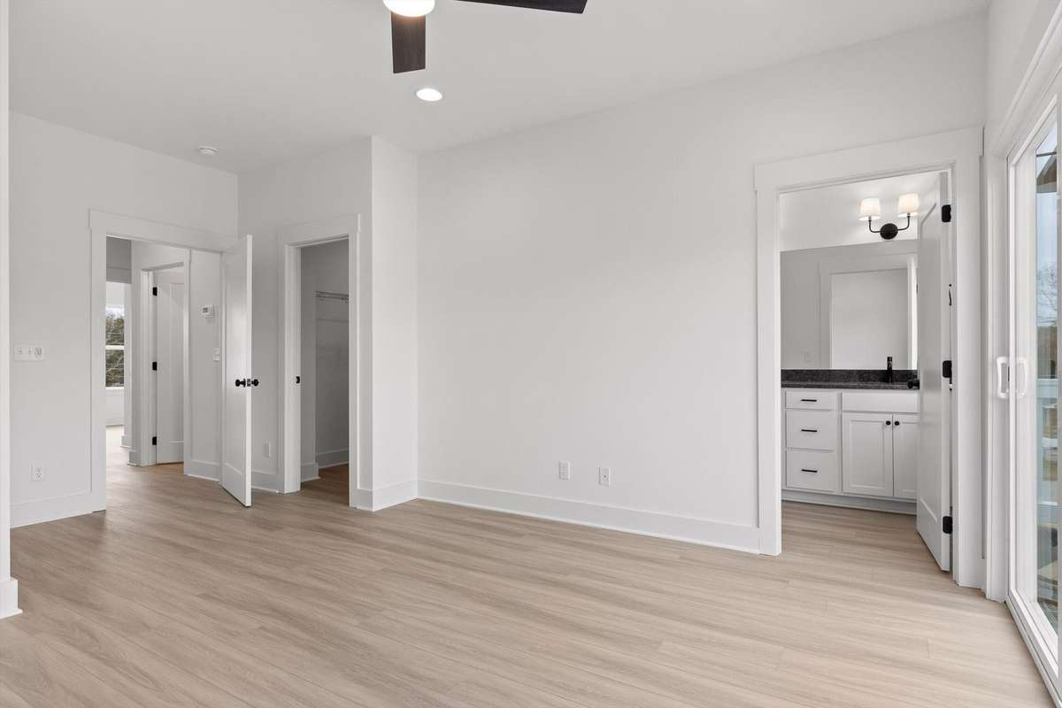 The main level features an open living and dining area with natural light, recessed lighting throughout, and direct access to the covered porch. The kitchen includes white shaker cabinetry, dark granite- style countertops, stainless appliances ( including the refrigerator) , matte- black hardware, and plenty of prep and storage space. The oversized peninsula gives you the perfect spot for quick meals or extra seating. Upstairs, the primary bedroom has its own private balcony, a large walk- in closet, and a full bath with a double vanity, upgraded cabinetry, matte black fixtures, and a tiled walk- in shower. Two additional bedrooms are also on the upper level, along with the laundry closet and a well- appointed guest bath.