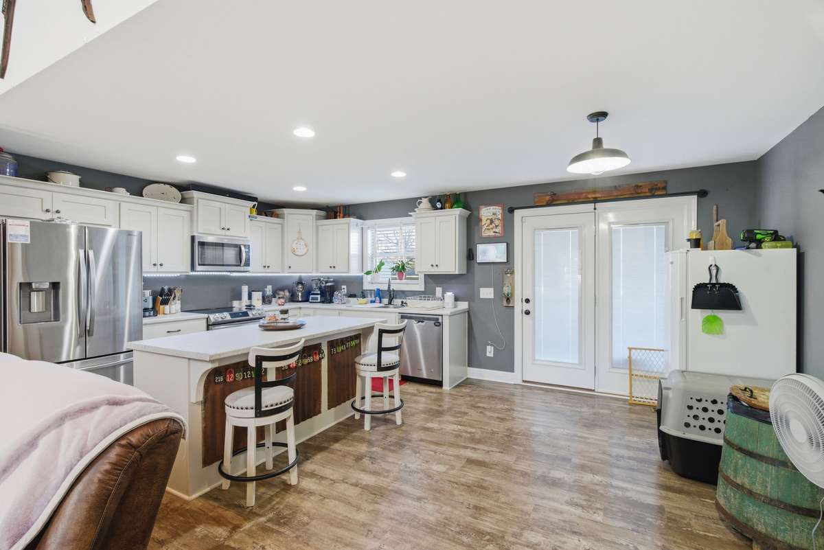 A lovely kitchen with stainless steel appliances, custom cabinets with varying heights, and a large kitchen island to gather around.