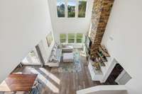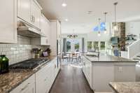 The heart of the home is the gorgeous living room, where natural light dances across vaulted ceilings and a striking stone fireplace creates a warm, grounding focal point. Custom built- ins frame the fire, giving the room character and a place to display your most meaningful pieces. The open flow carries you into a bright dining area and a beautifully designed kitchen filled with features you’ll appreciate every single day—double ovens, a gas range, granite countertops, an eat- in island, and a generous walk- in pantry.
