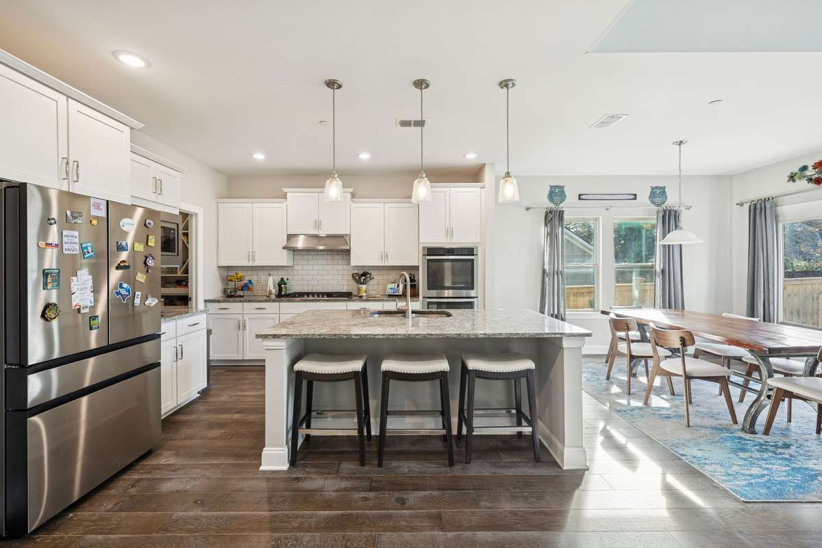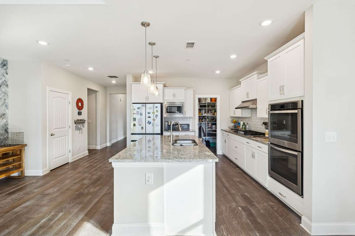 The heart of the home is the gorgeous living room, where natural light dances across vaulted ceilings and a striking stone fireplace creates a warm, grounding focal point. Custom built- ins frame the fire, giving the room character and a place to display your most meaningful pieces. The open flow carries you into a bright dining area and a beautifully designed kitchen filled with features you’ll appreciate every single day—double ovens, a gas range, granite countertops, an eat- in island, and a generous walk- in pantry.