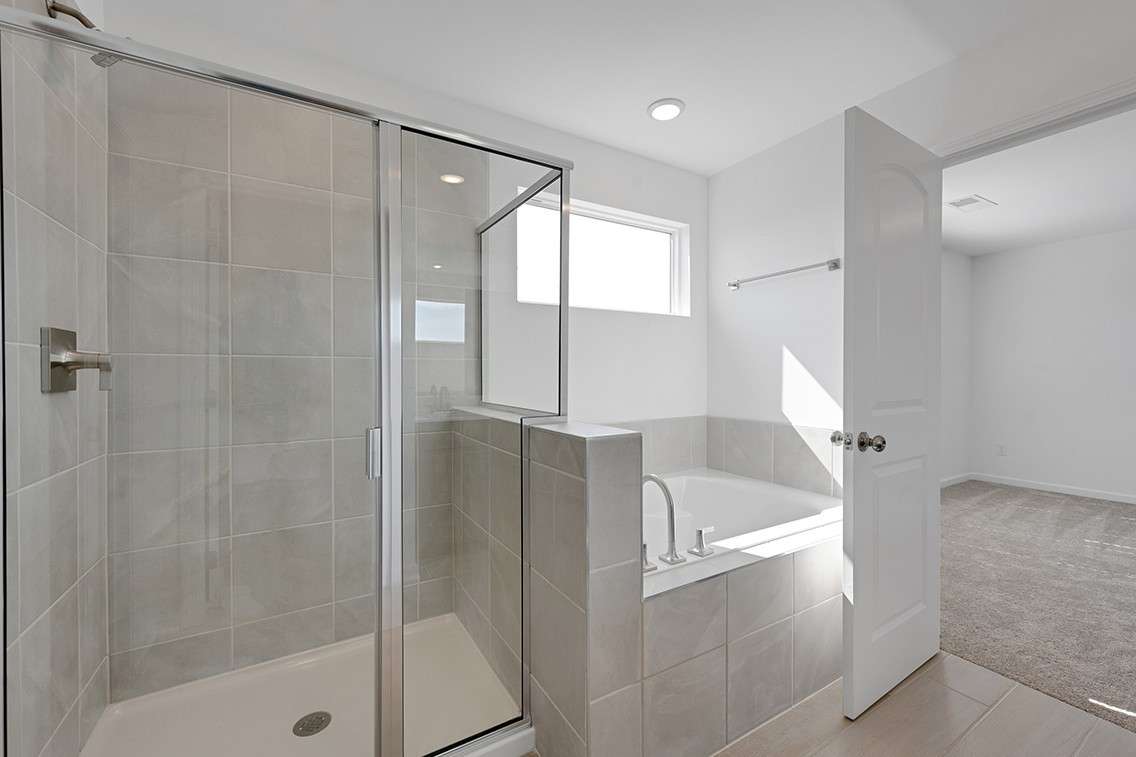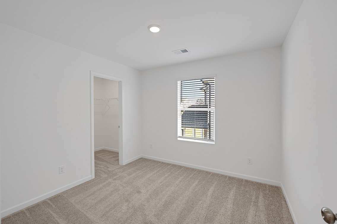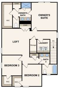 Upstairs, the thoughtful layout places the owner’s suite opposite two secondary bedrooms, separated by a versatile loft—great as a play area, media room, or home workspace. Wood tread stairs with wrought iron spindles elevate the home’s style. Both secondary bedrooms include walk- in closets, and the shared bath features dual sinks with a separate tub and toilet area for easy routines.