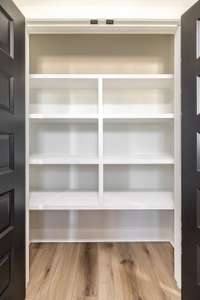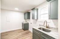 The laundry room is its own moment—rich olive cabinetry, generous pantry space, and storage that brings beauty and practicality together.