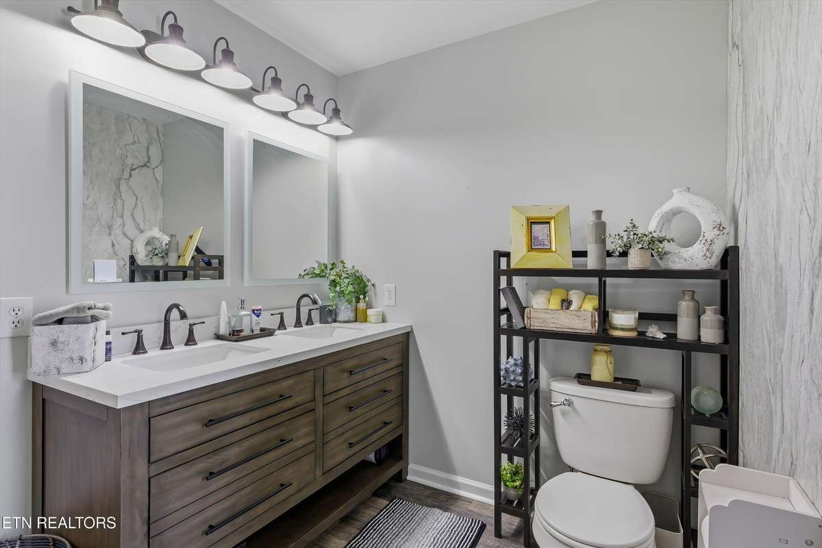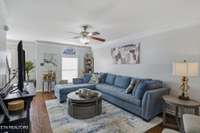 A full laundry room adds convenience on the main level. Upstairs, the expansive primary bedroom serves as a true retreat with its ensuite bathroom showcasing a tiled walk- in shower, double vanity, and a roomy walk- in closet.