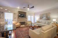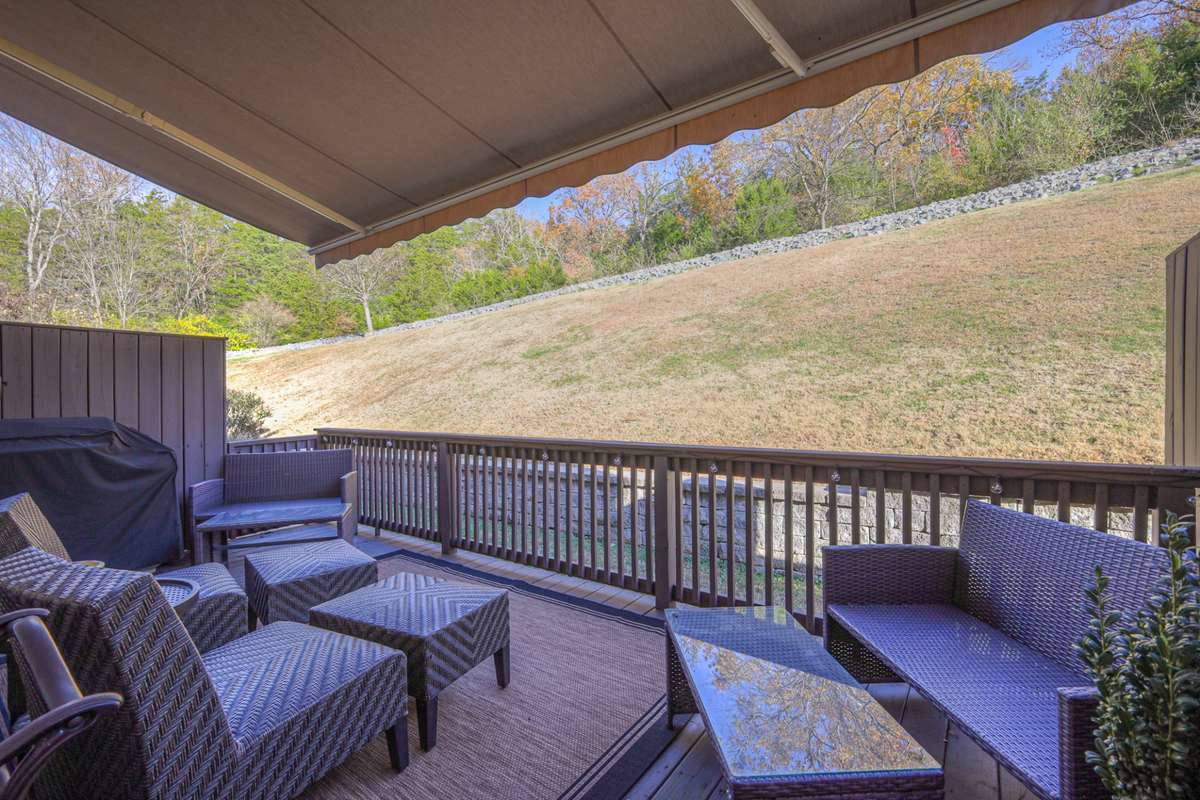 The outdoor space features a natural gas hook- up, French doors with retractable screens, and a remote- controlled retractable awning that provides shade and comfort at the touch of a button. Inside, the main level boasts hardwood floors and a cozy gas fireplace. Upstairs, the plush carpeting adds warmth, and the spacious primary suite includes dual sinks, a walk- in shower, and a private toilet room. The second bedroom boasts a spacious closet and its own en suite.