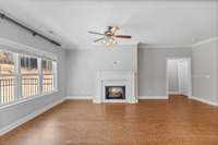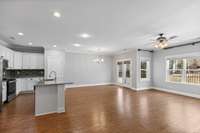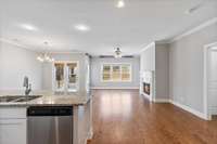 Welcome home to this beautifully designed one- level townhouse offering 1, 897 sq. ft. , 3 bedrooms, and 2 full baths in a desirable split- bedroom layout. Enjoy wood flooring throughout, with tile in the bathrooms and laundry room, and a thoughtful floor plan featuring a spacious great room with a natural gas fireplace. The kitchen boasts granite countertops, white cabinetry, tile backsplash, stainless steel appliances ( including refrigerator) , pantry, and an adjoining dining area with French doors leading to the back patio with railing.
