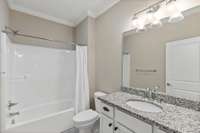 The primary suite features an oversized walk- in closet, double- vanity bath with granite countertops, and a walk- in tile shower with grab bars for added convenience. A secondary bedroom includes a Murphy bed that remains with the property. Additional highlights include a dedicated laundry room with cabinets and shelving, mud room with cabinetry, gas heat, Hardiboard siding, and a two- car main- level garage with a ramp.