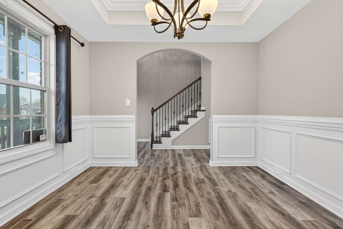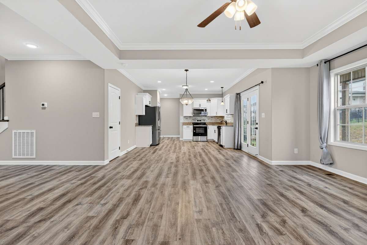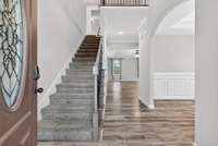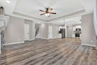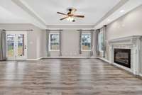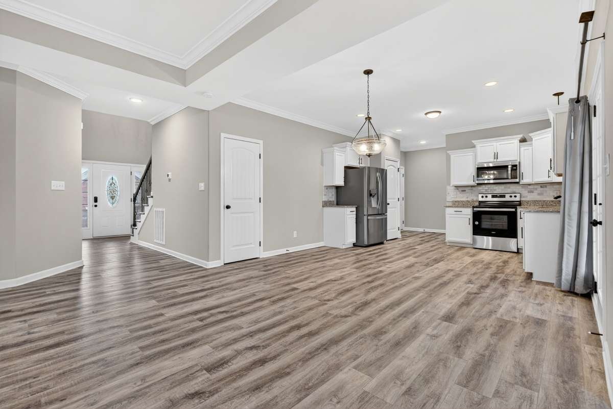 Open kitchen with granite countertops, tile backsplash, and two pantries, flowing into a large great room with an electric fireplace. Formal dining room, wood and tile flooring, and a true laundry room. Spacious primary suite with an oversized tile shower with built- in bench, double vanity, and a large walk- in closet ( approx. 12x7 in areas) . Home also includes a pressure booster, permanent exterior holiday lights, and a covered deck.