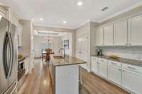 The crisp white kitchen features expansive granite countertops, under- cabinet lighting with multiple settings, and the flexibility to convert from electric to gas cooking ( if gas is connected) . The adjoining living room offers a warm, welcoming space to unwind or entertain.