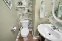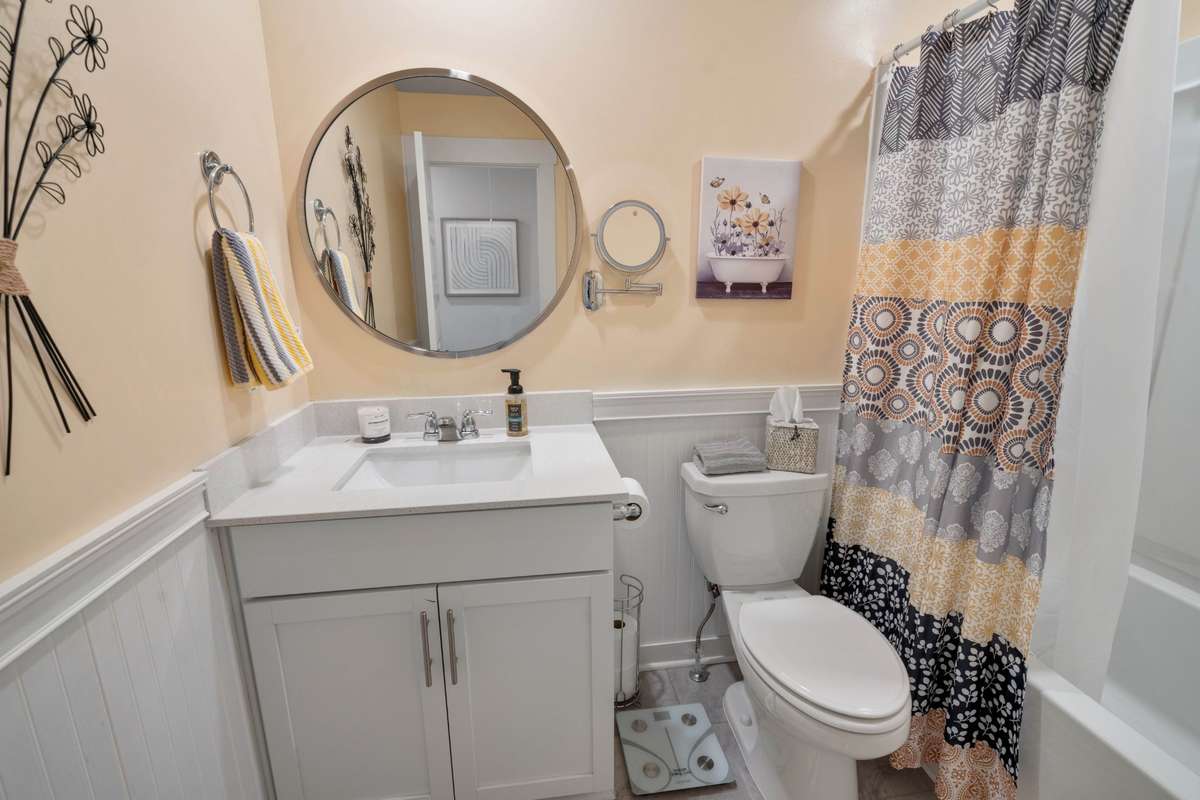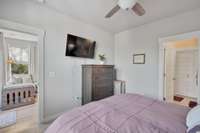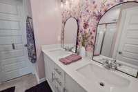 The main- level primary suite includes an oversized glass- door shower, double quartz vanity, and a walk- in closet with a newly added custom closet system. Upstairs offers two additional bedrooms and a versatile loft—perfect for an additional living area, office, or playroom.