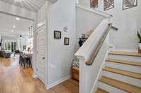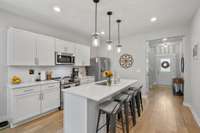Inside, you’ll immediately notice enhancements that set this home apart. The inviting open- concept kitchen features a large island with seating overhang, shaker cabinetry, quartz countertops, stainless steel appliances, and a spacious pantry. Durable LVP flooring runs throughout all main living areas and bathrooms for easy upkeep.