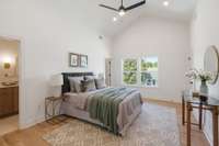 Upstairs, the private owner’s suite offers his and her closets in a beautiful vaulted bedroom, and a serene bath with dual vanities and a tiled shower. Two additional bedrooms and a second full bath provide space for guests, family, or a home office.
